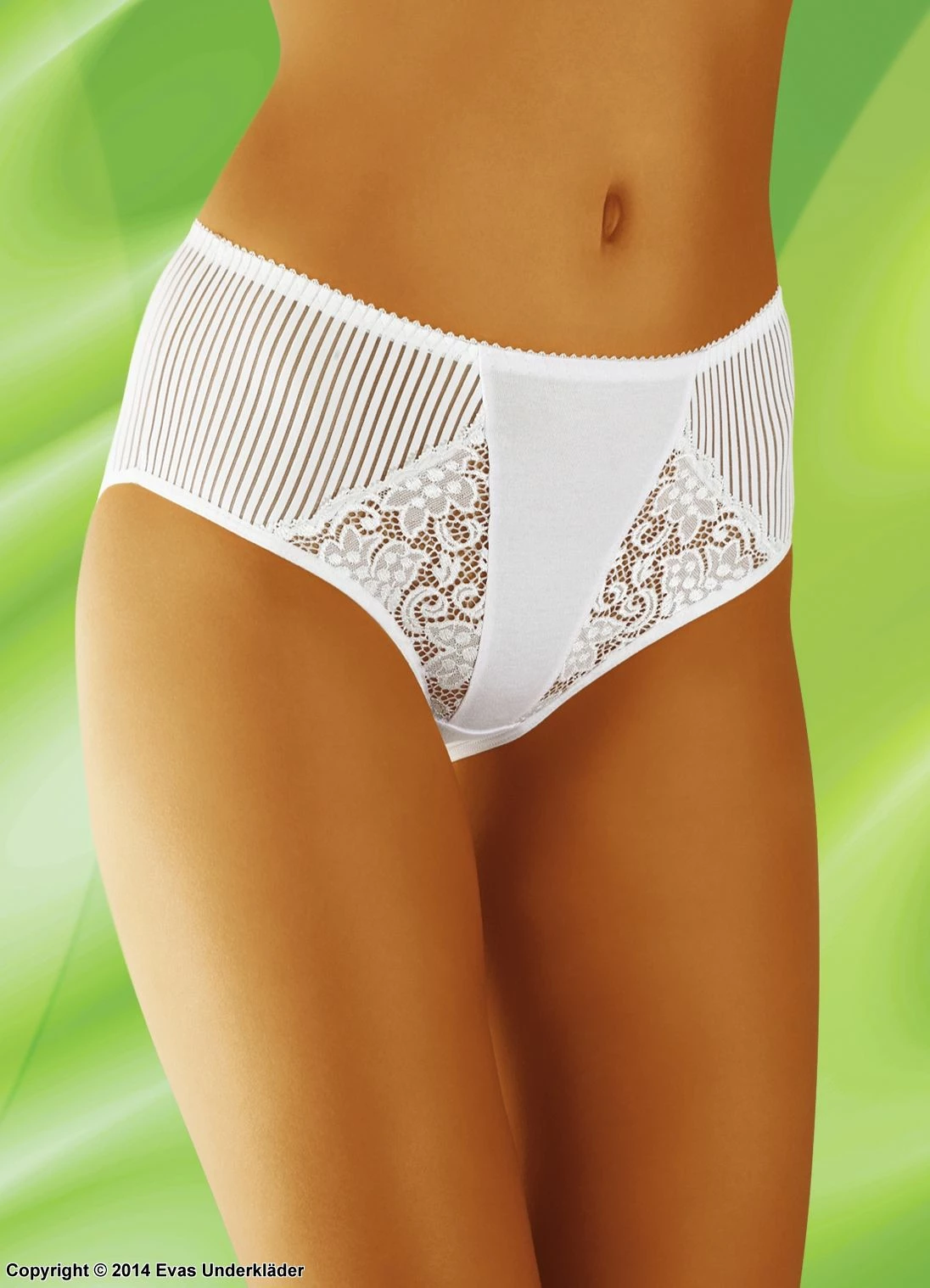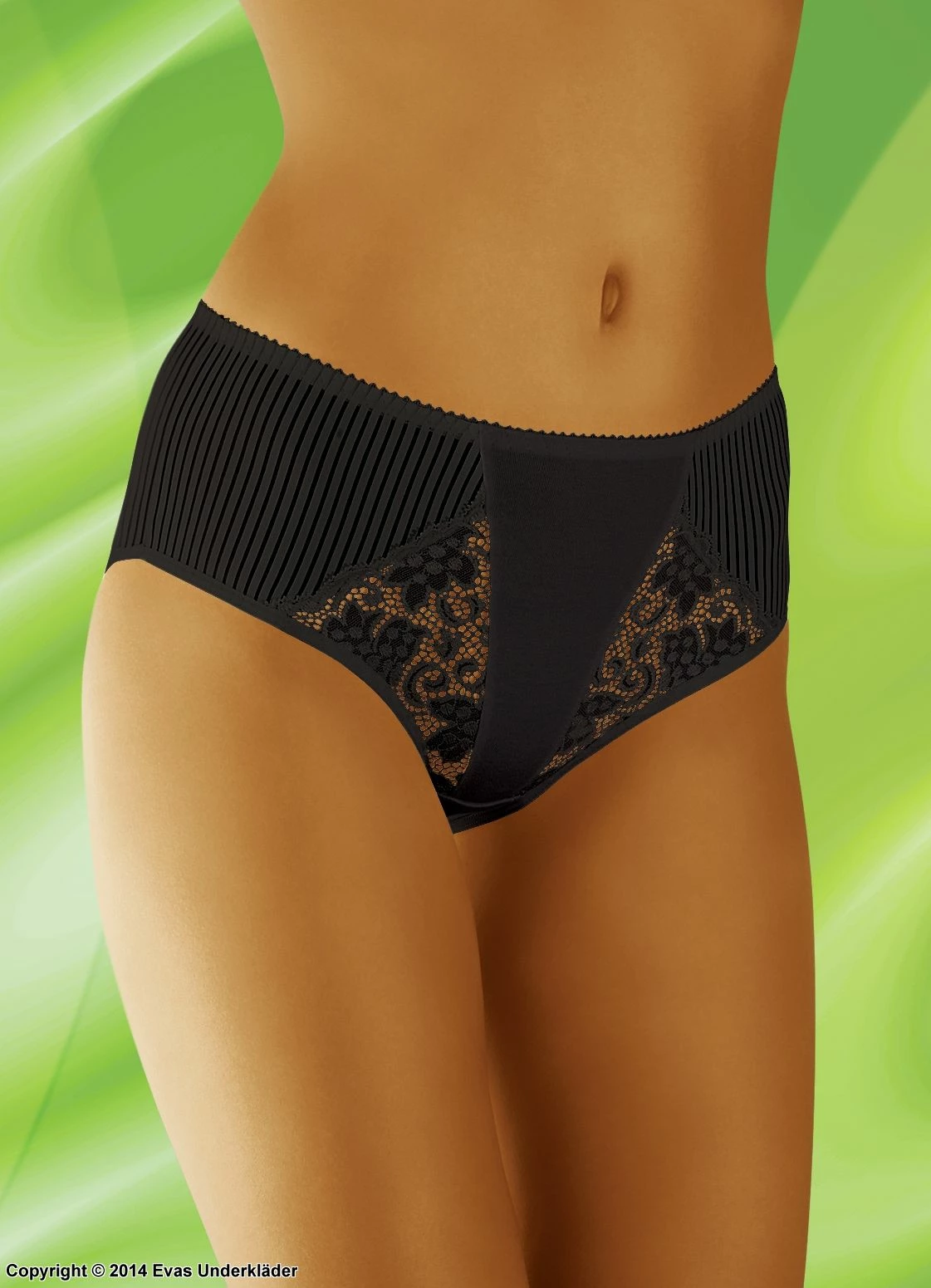 Midrise panty is lovely with lace inserts. The front of the panty has striped side panels on either side of a wedge-shaped lace insert. The center of the panty is a solid stripe. The light panty is comfortable and easy to wear any day of the week.