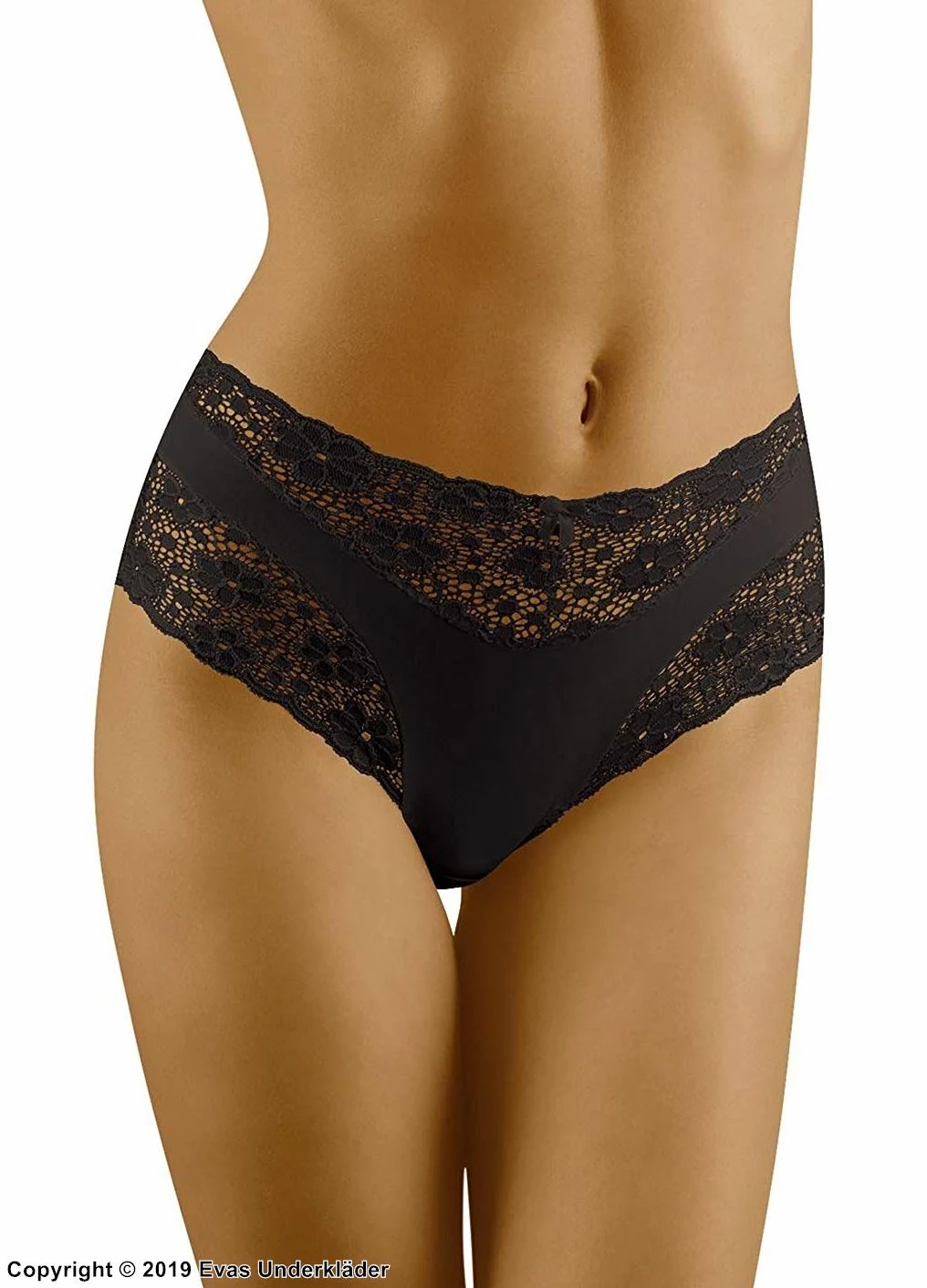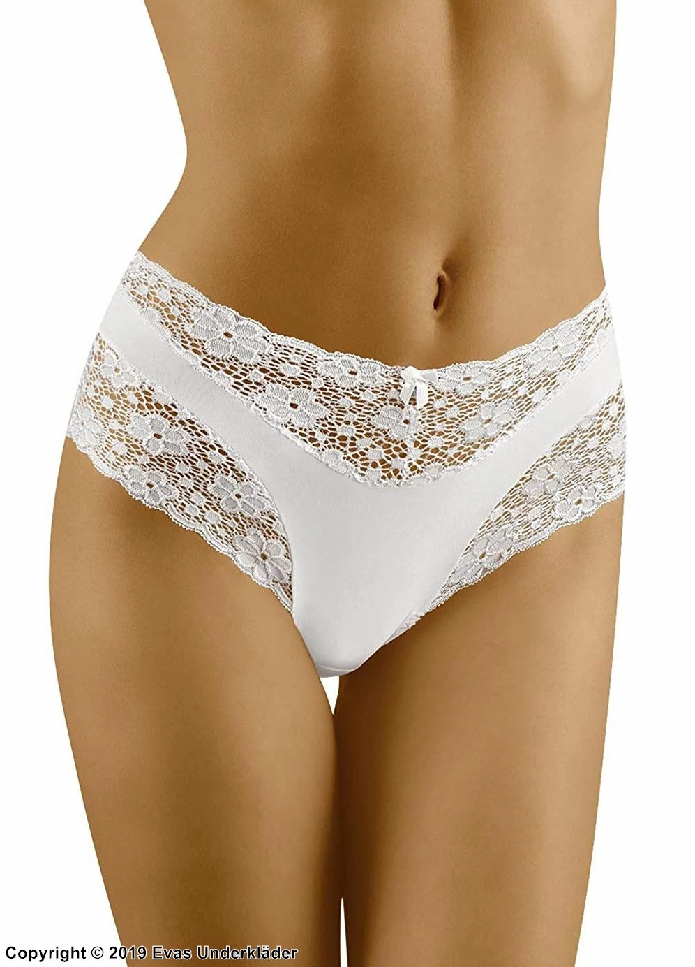 Elegant panty is pretty with lace trim across the waistband and leg openings. The panty has a high waist with a small bow in the center with a scoop of intricate lace at the waist and over each leg. The elegant panty is lovely under any outfit.