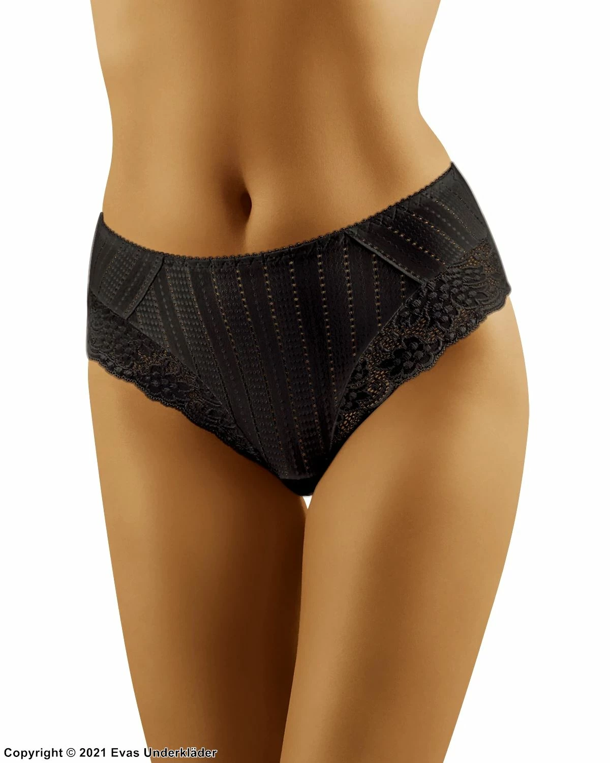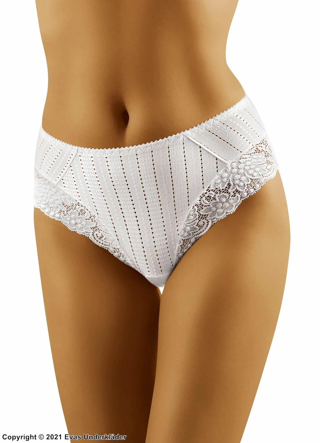Pretty panty is elegant with lace leg openings and a textured stripe. The striped panty has a high waist and high leg openings. The leg openings are framed in a wide lace band that complement with striped front of the panty. The pretty panty is elegant under any outfit.