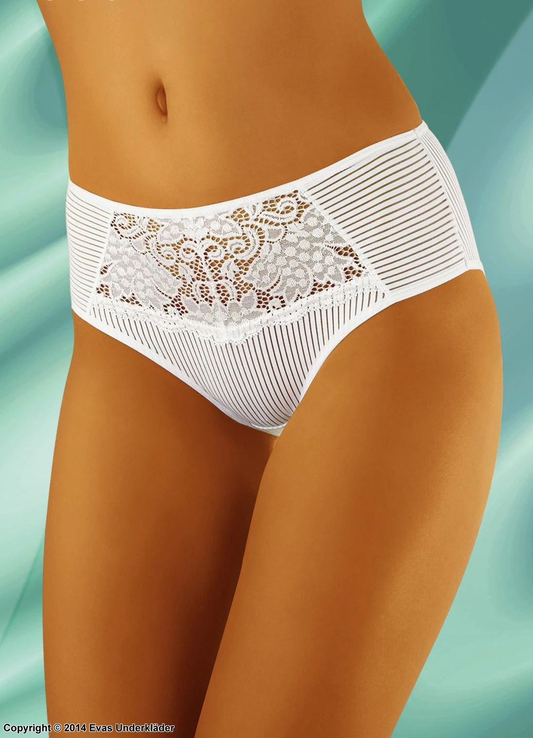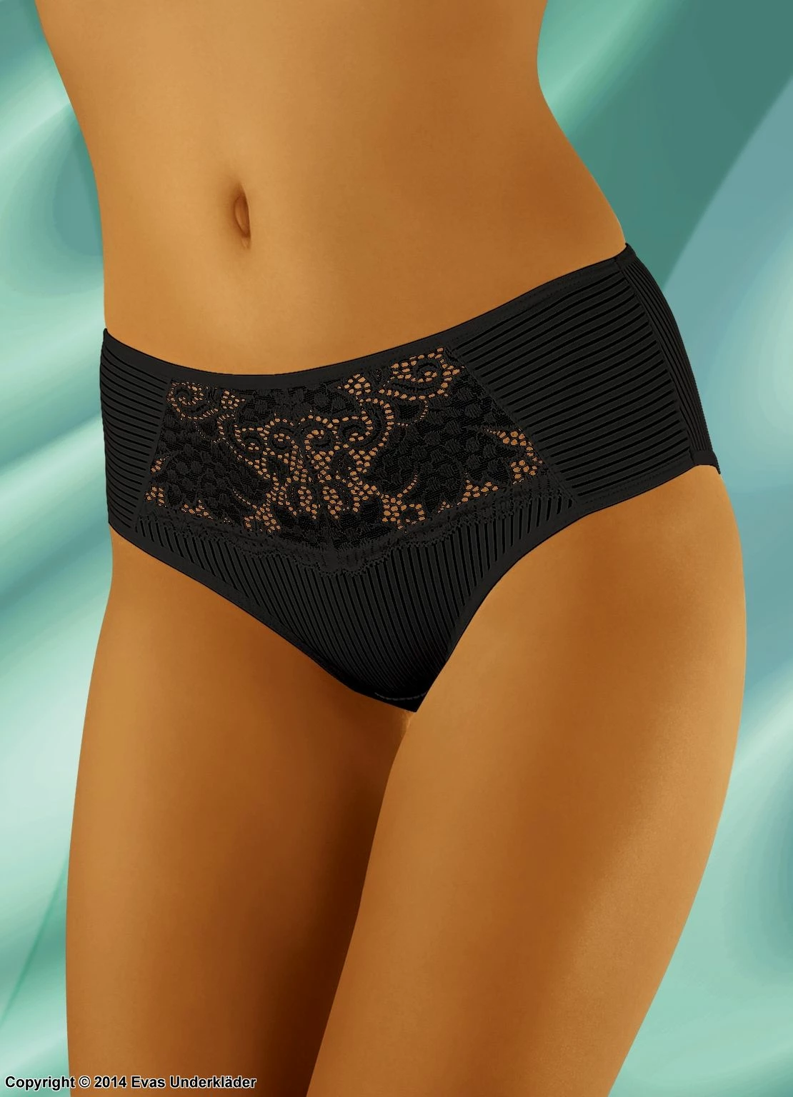 Elegant panty is easy to wear with a lace insert in the front. The panty has stripes along the sides and back with a wide block of lace in the front. The panty has a medium rise and is comfortable under any outfit.