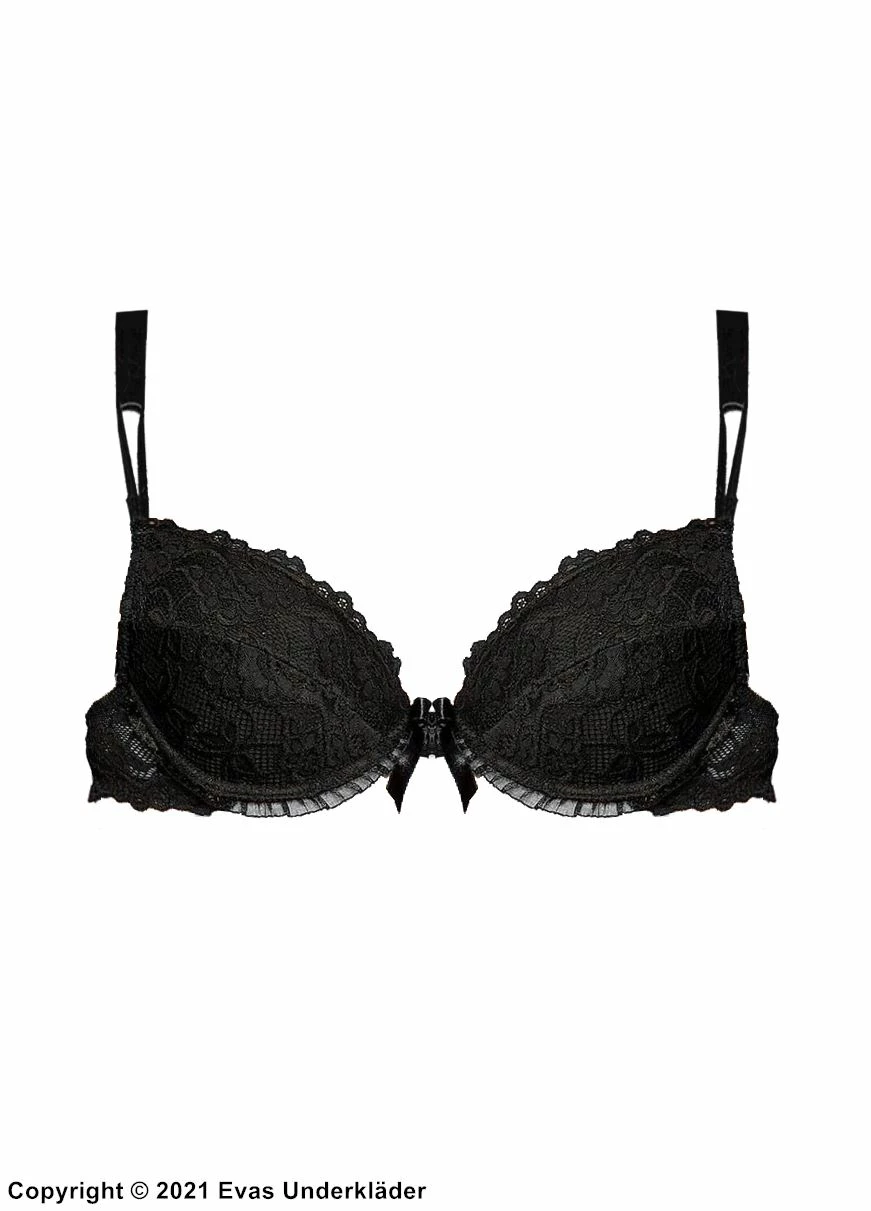 Lovely push-up bra is covered in eyelet lace. The fun push-up bra has light eyelet lace over a matching background creating a complex look. The center of the two push-up cups is a large ribbon. The bottom of the cups are edged with a sheer ruffle. The bands of the bra are detailed in sheer eyelet lace.