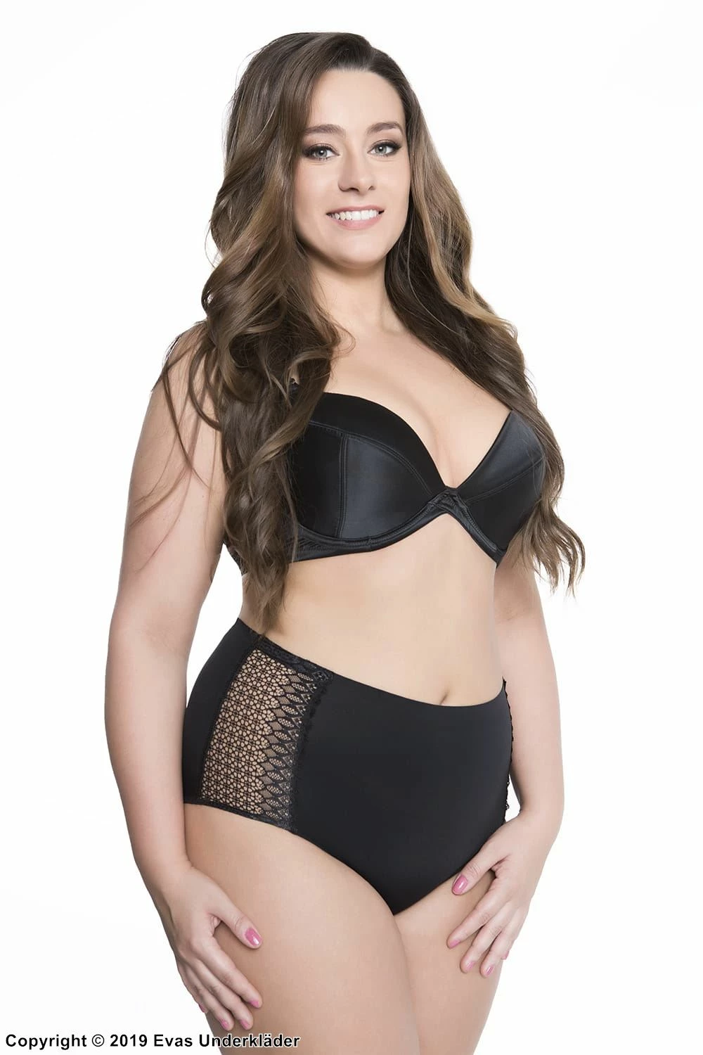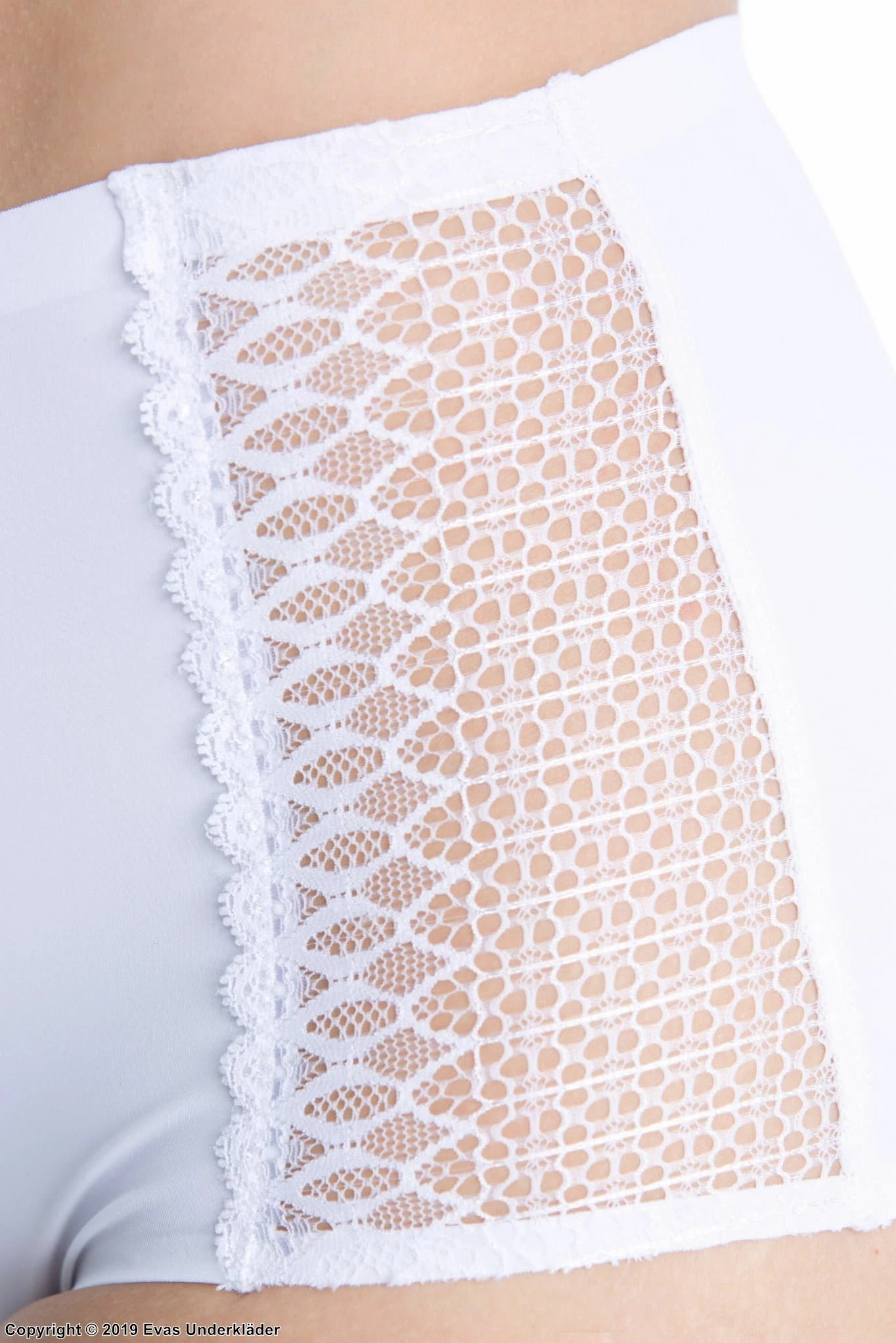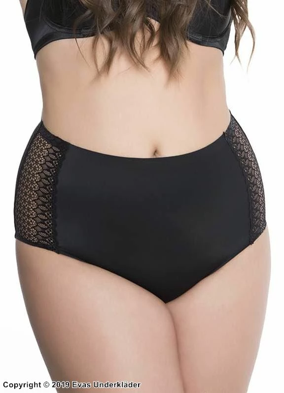 High waist; lace inlays; plain back - Fabric specification: 89% polyamide, 10% elastane (a.k.a Spandex / Lycra), 1% cotton