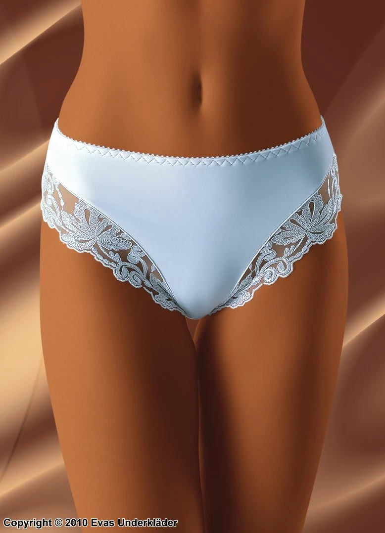 Pretty panty is elegant with embroidered lace leg openings. The panty is solid with a scalloped waistband and lace leg openings. The embroidered lace shines in a muted color. The elegant panty is lovely under any outfit.