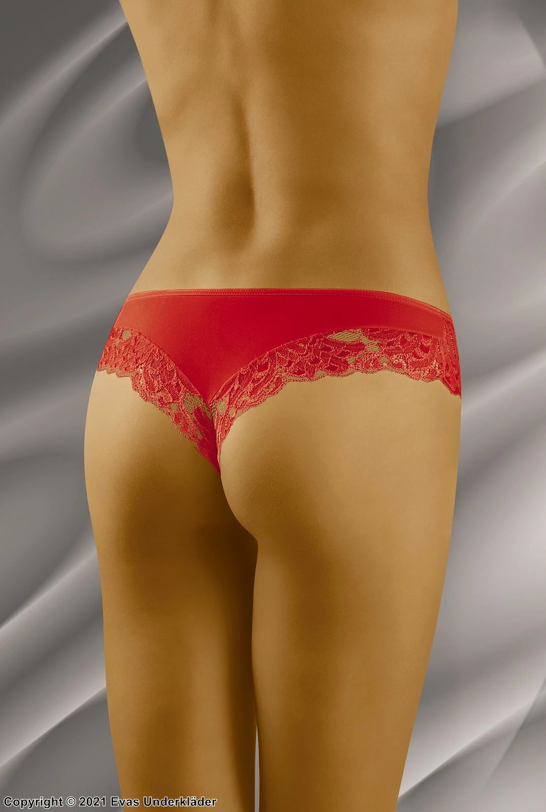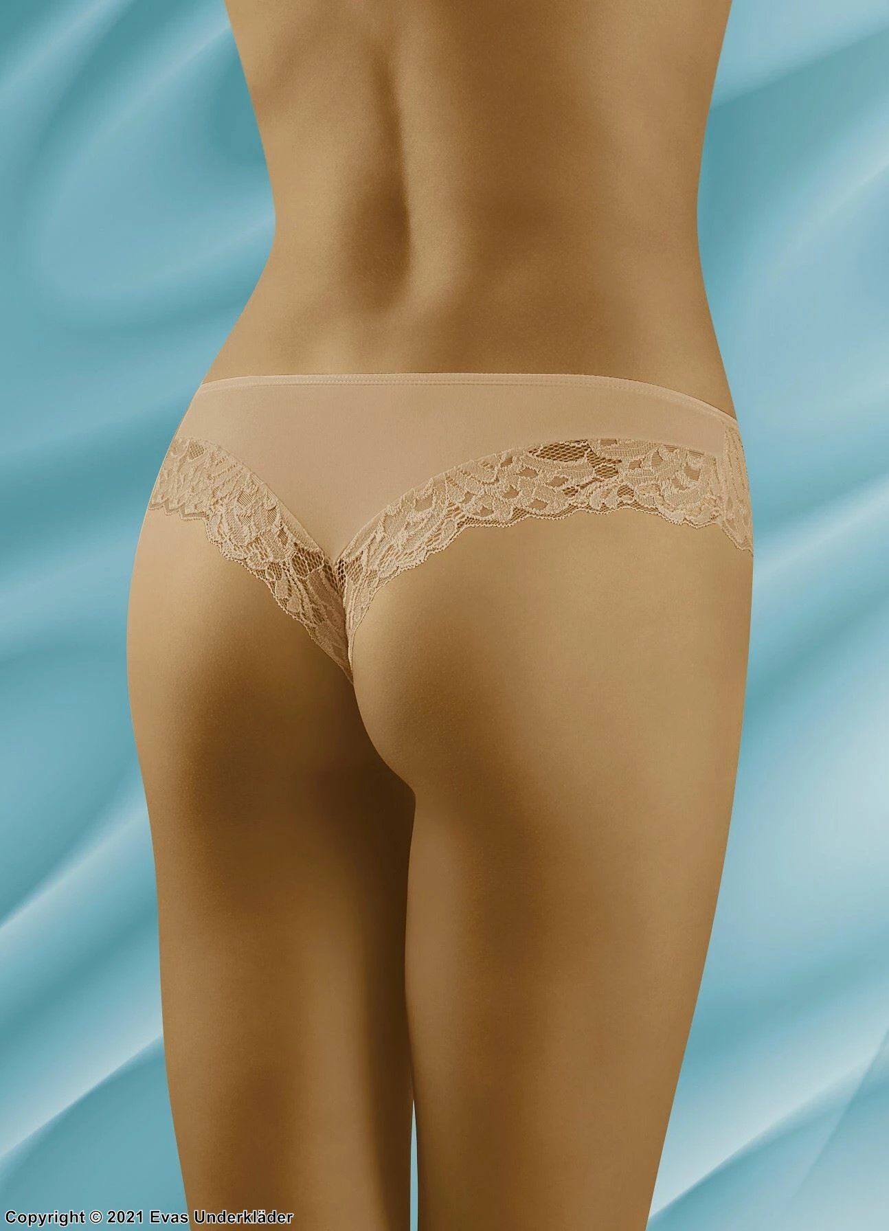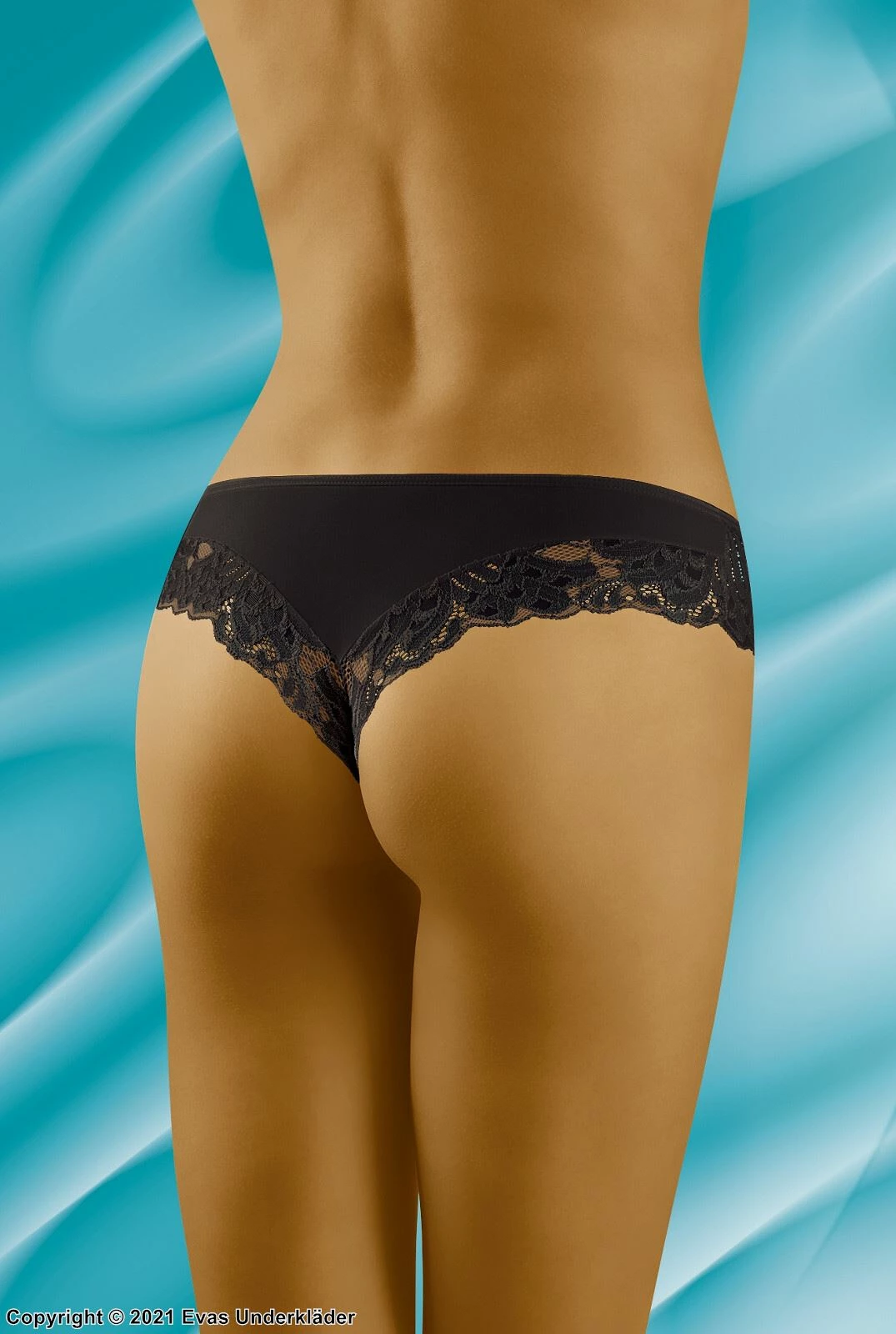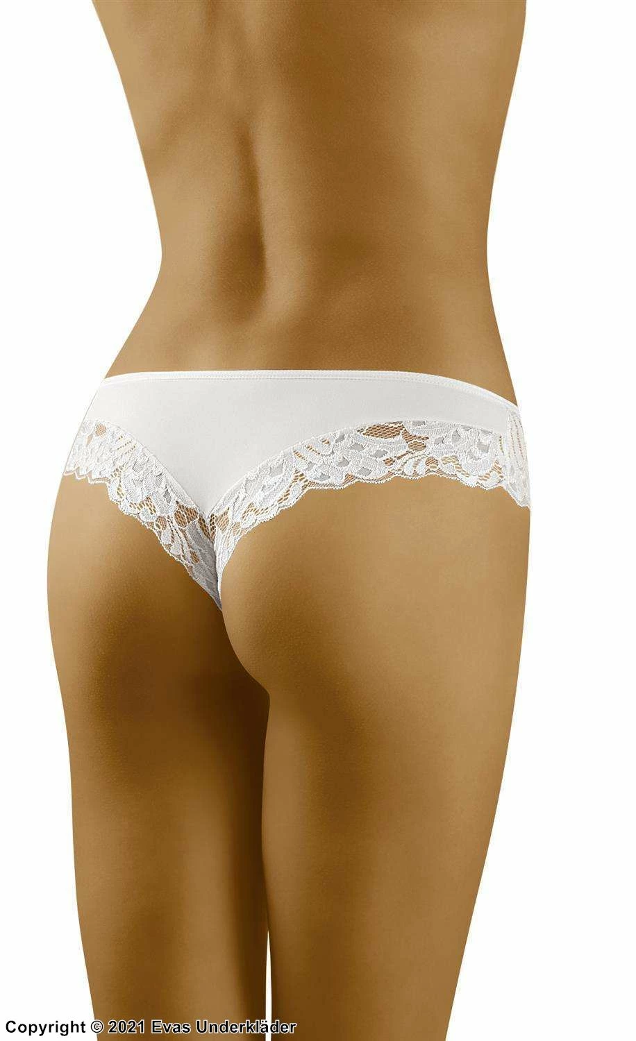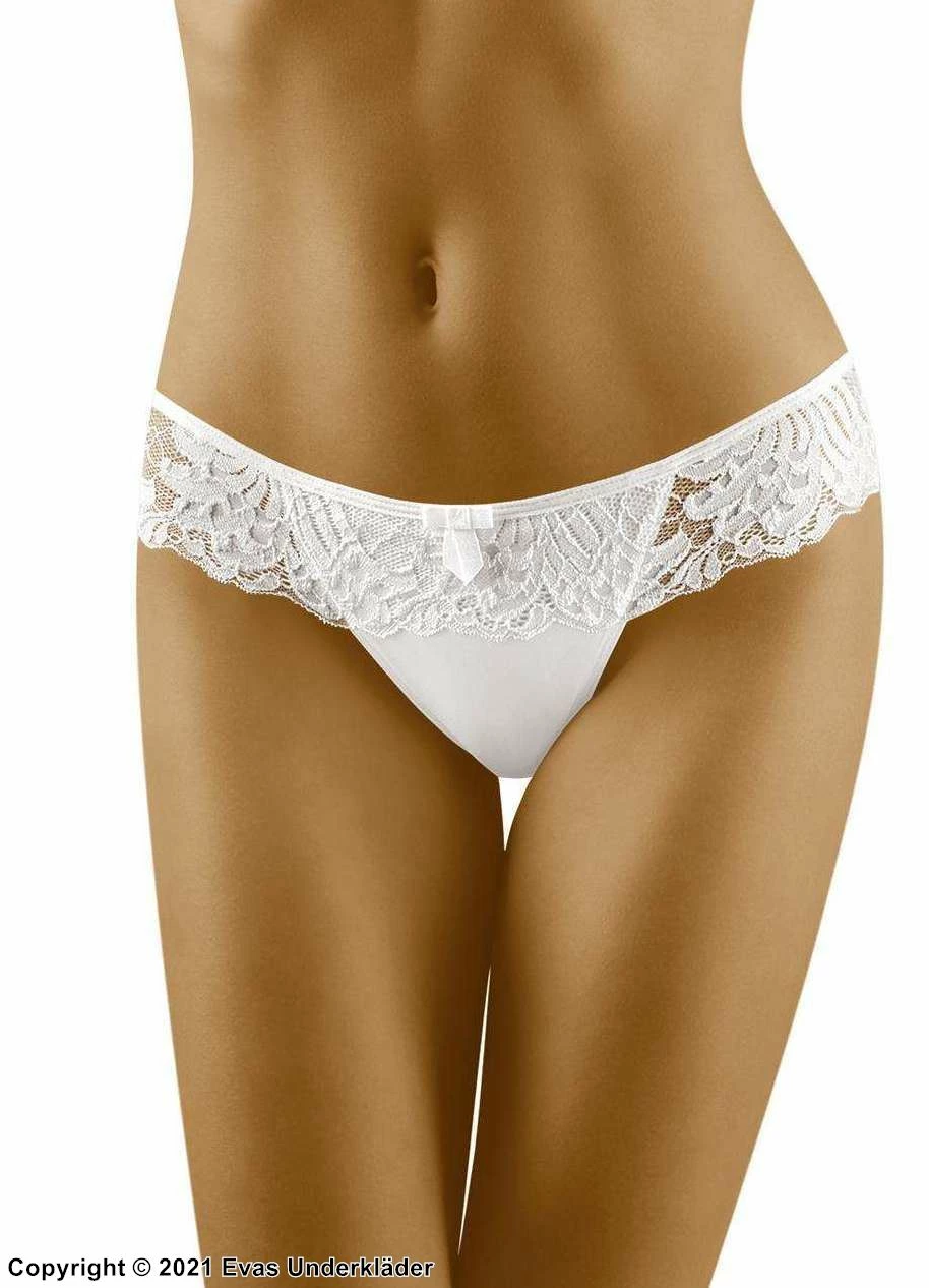 Pretty panty has lace waistband over a knit front. The pretty panty has a small bow in the center of a wide lace band that circles the hips. The elegant panty is lovely for a special occasion or everyday.