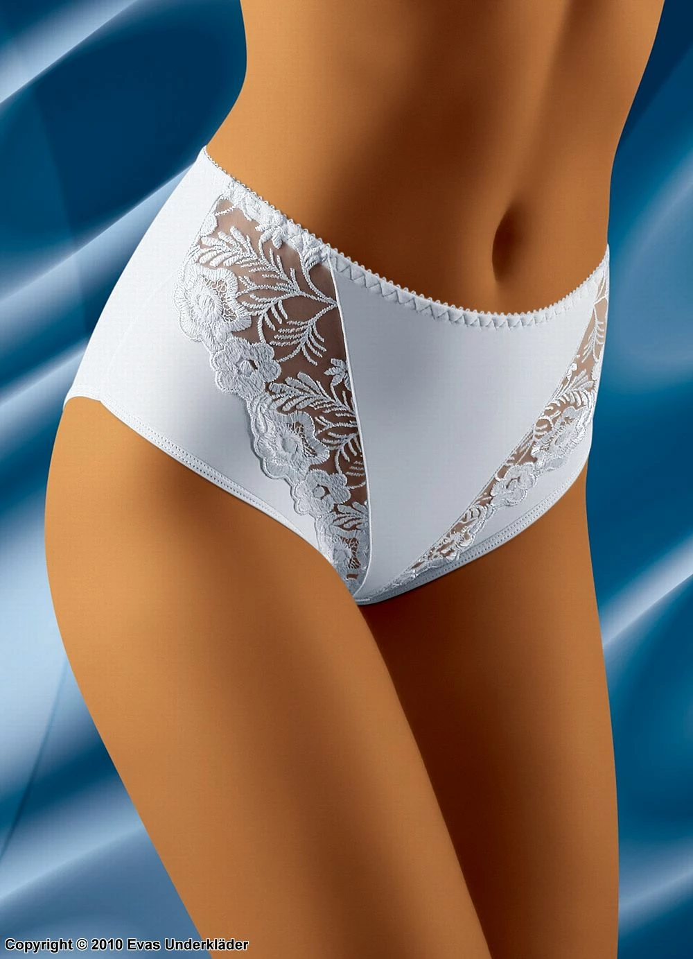 High waisted panty is elegant with floral lace inserts. The bold panty has a center solid section with solid material over the hips and back. The front of the panty has lace hips inserts in a bold floral. The pretty panty is perfect for every day.