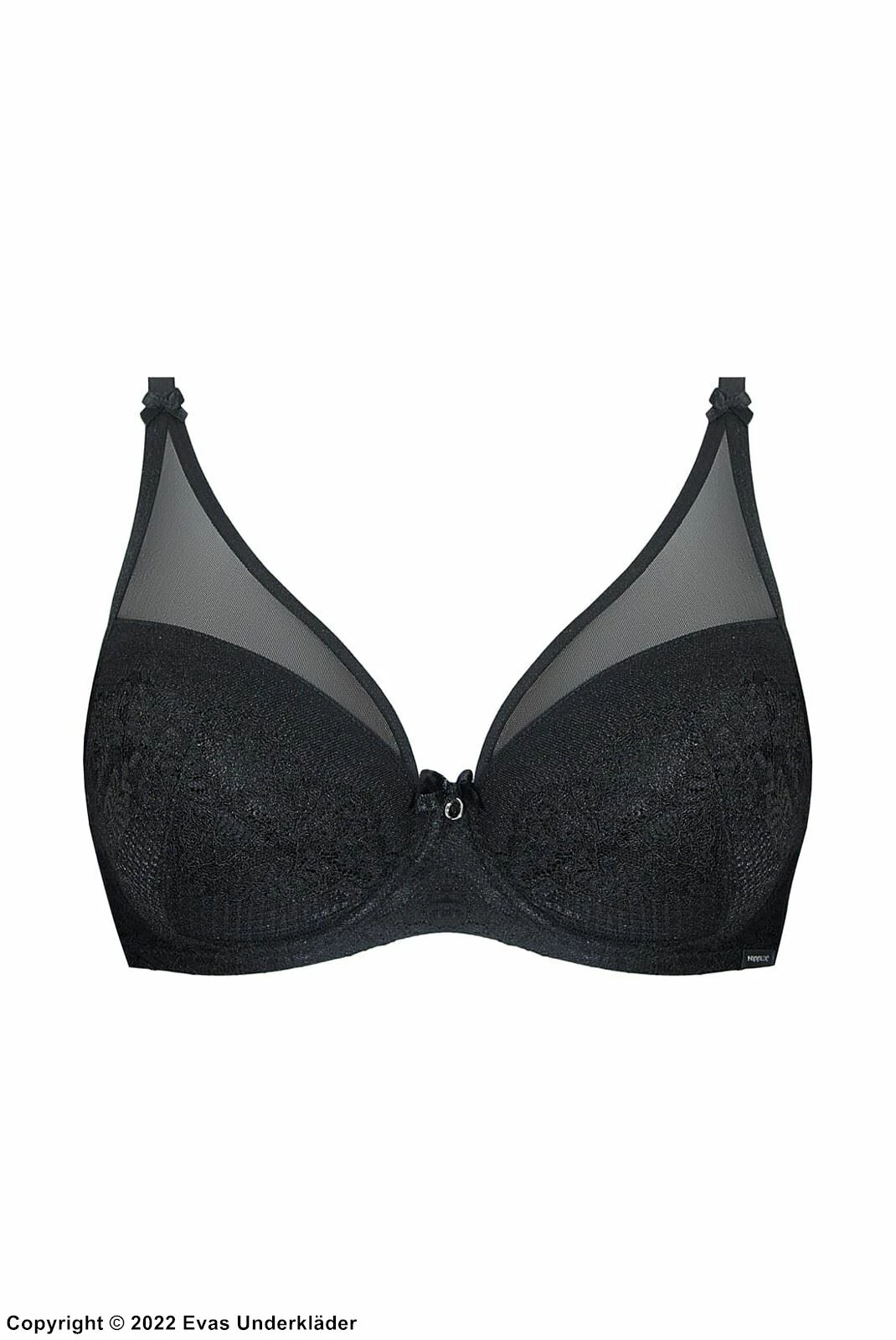 Lace cups; mesh inlay - Fabric specification: 60% polyamide, 16% polyester, 10% cotton, 7% elastane (a.k.a Spandex / Lycra), 7% other fibers.