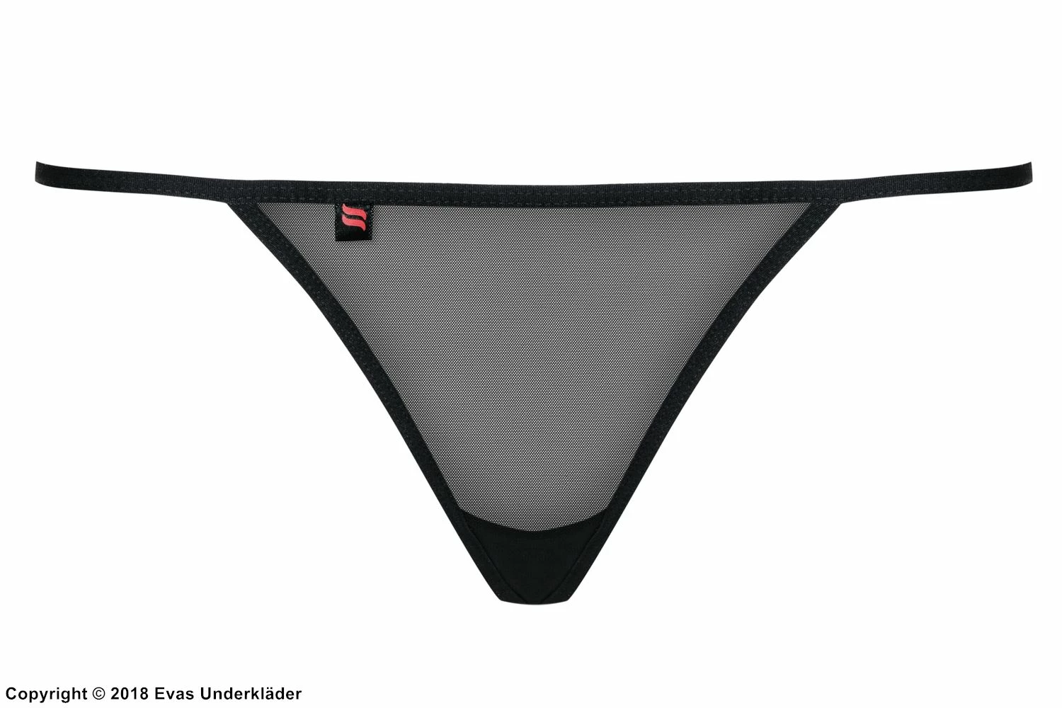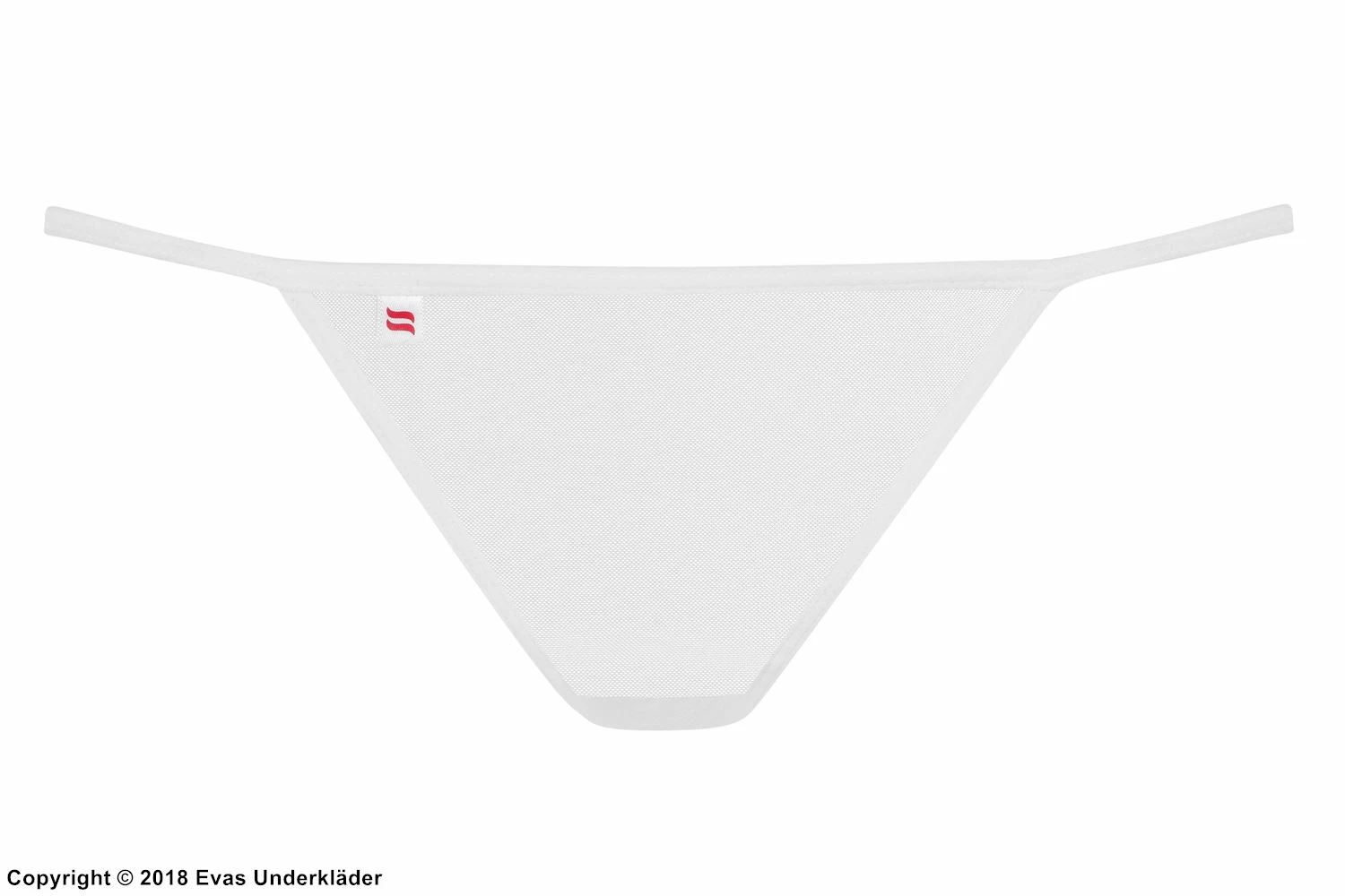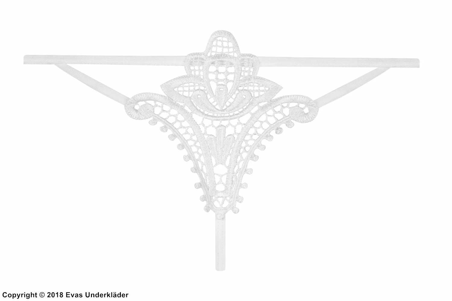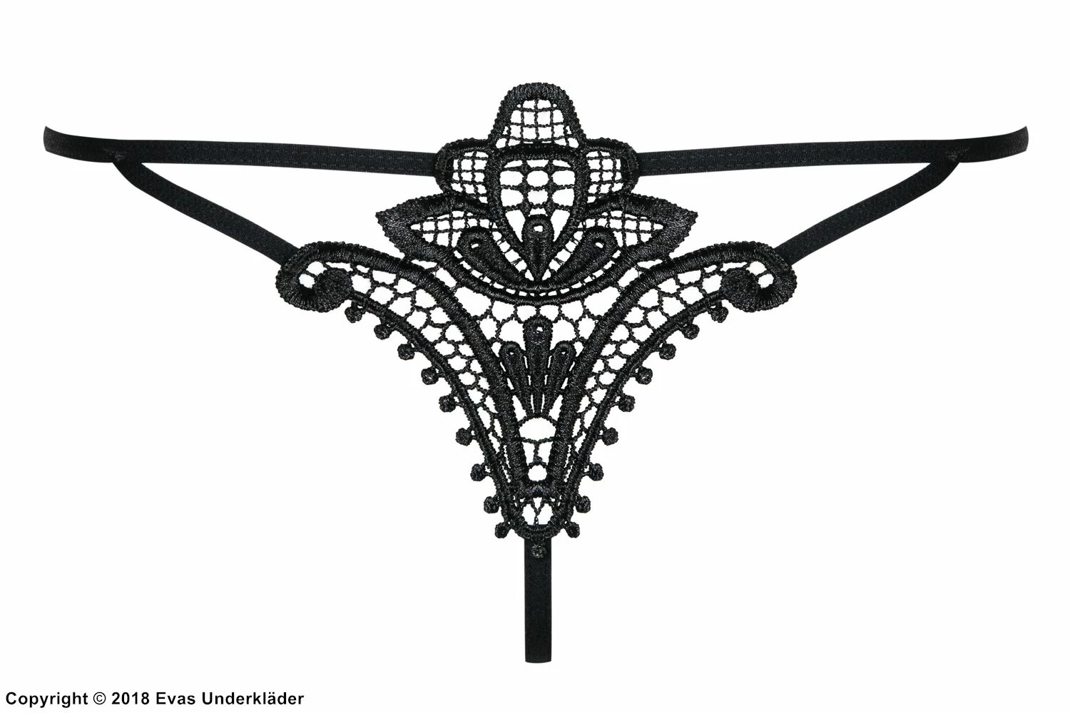 Lovely thong panty has an open lace work design. The sheer mesh thong panty is solid in the front with an intricate open lace detail in the back. The floral lace makes the thong panty a lovely addition to a lingerie collection.