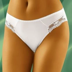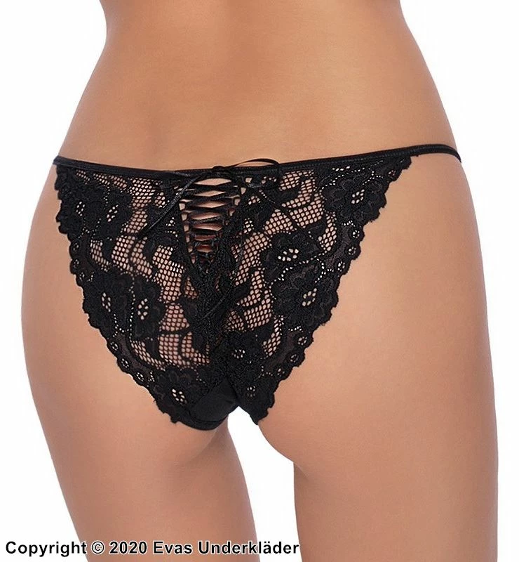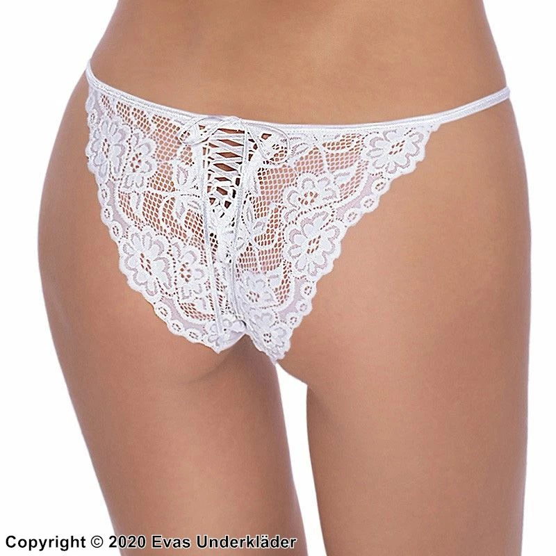 Beautiful panty is light in only lace. The sheer lace covers the front and back of the highcut panty. The panty is cut high on the legs with a string on either hip. The lovely panty can be worn for everyday or special occasions.